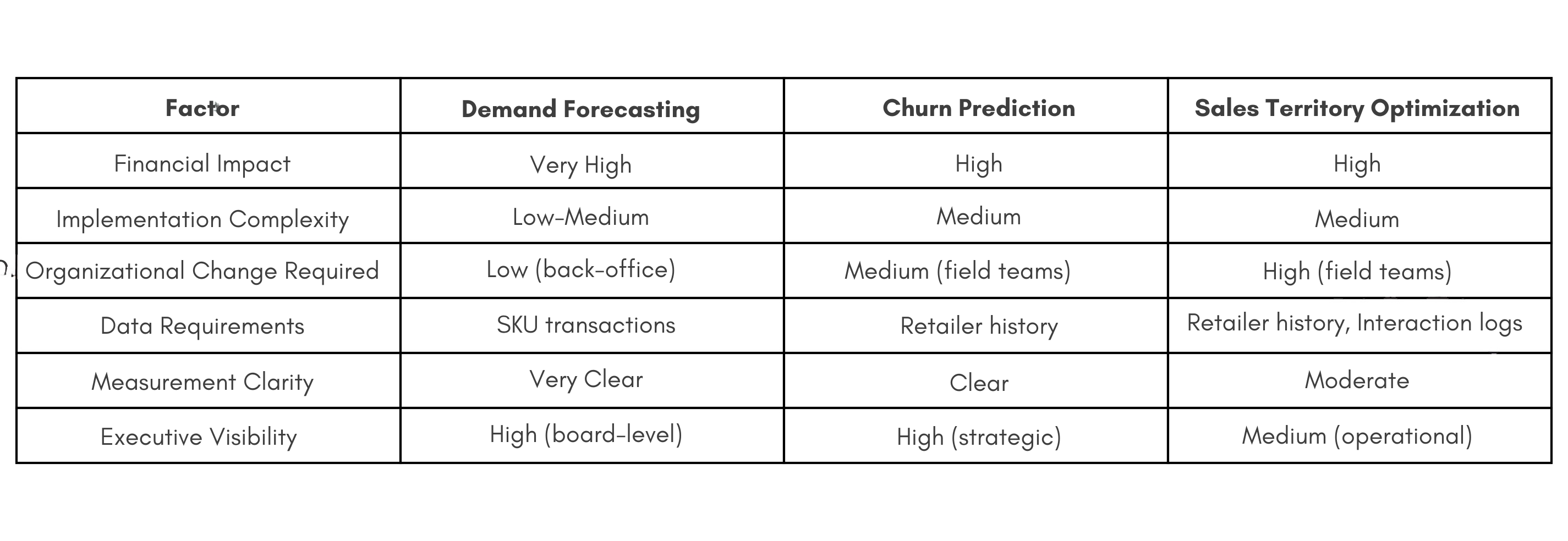 Resource allocation: At the territory level, AI helps sales managers balance their team across competing priorities—retention interventions, growth opportunities, maintenance visits, and new retailer recruitment—based on expected returns.
