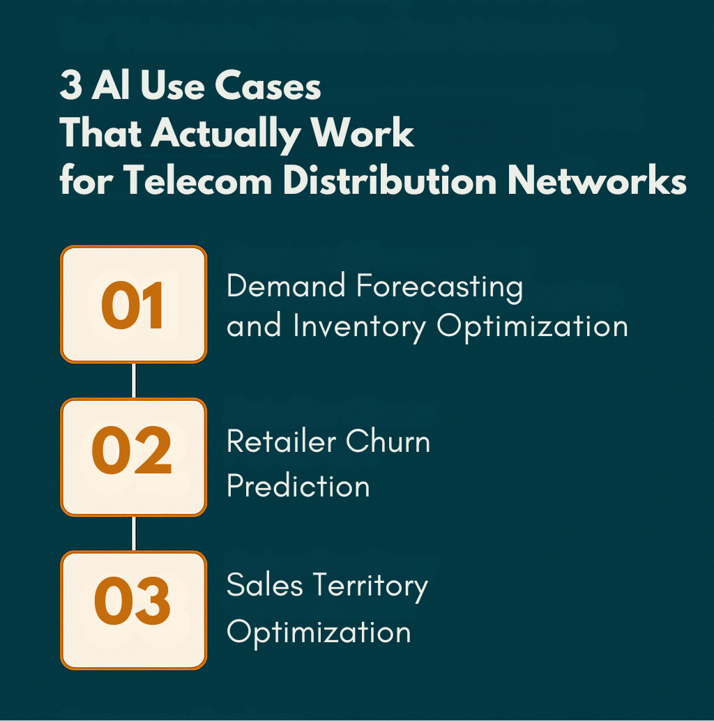 This guide explores three proven AI use cases that consistently deliver strong returns for telecom distribution: demand forecasting and inventory optimisation, retailer churn prediction, and sales territory optimisation.